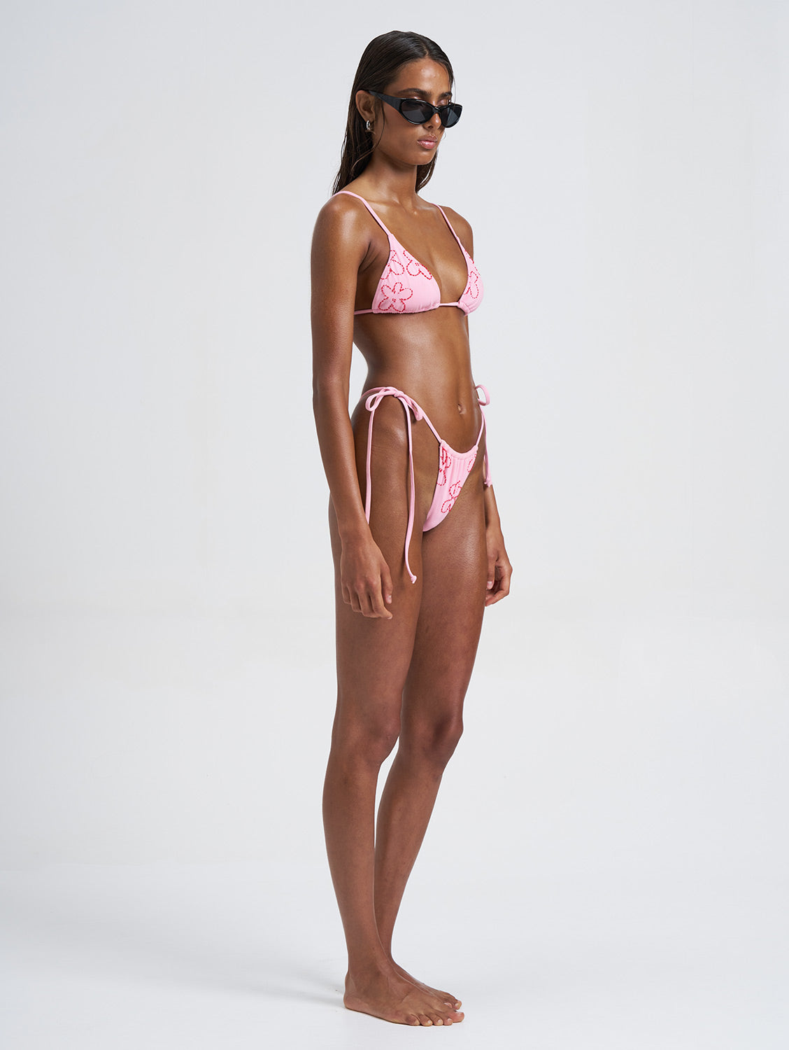 The Darya Tie Side Bikini Bottom is a classic swimwear style featuring hand-embroidered floral detailing. The design is set on a soft pink base with red floral motifs stitched using natural fibres. Crafted from Italian-sourced recycled nylon yarns, the style is fully lined in the same fabric.
