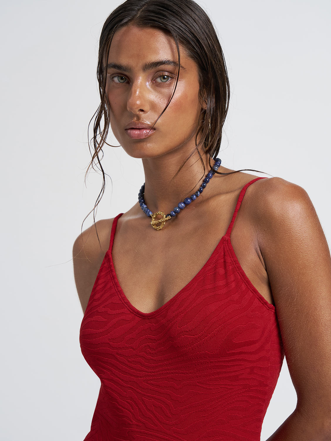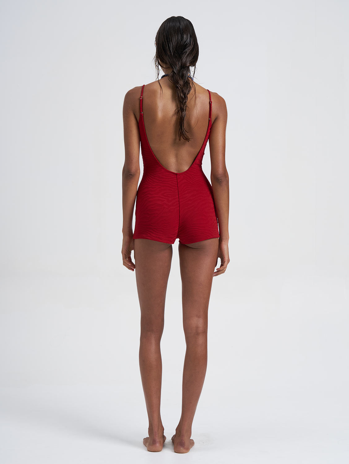 The Freya Swim Short Romper reimagines one-piece ease with a sculpted, feminine silhouette. Crafted from a richly textured deep-red jacquard fabric, Freya offers a luxurious feel that moves seamlessly from swim to resort wear. A low back and soft scoop neckline create an elegant balance, while adjustable straps ensure a personalised fit.